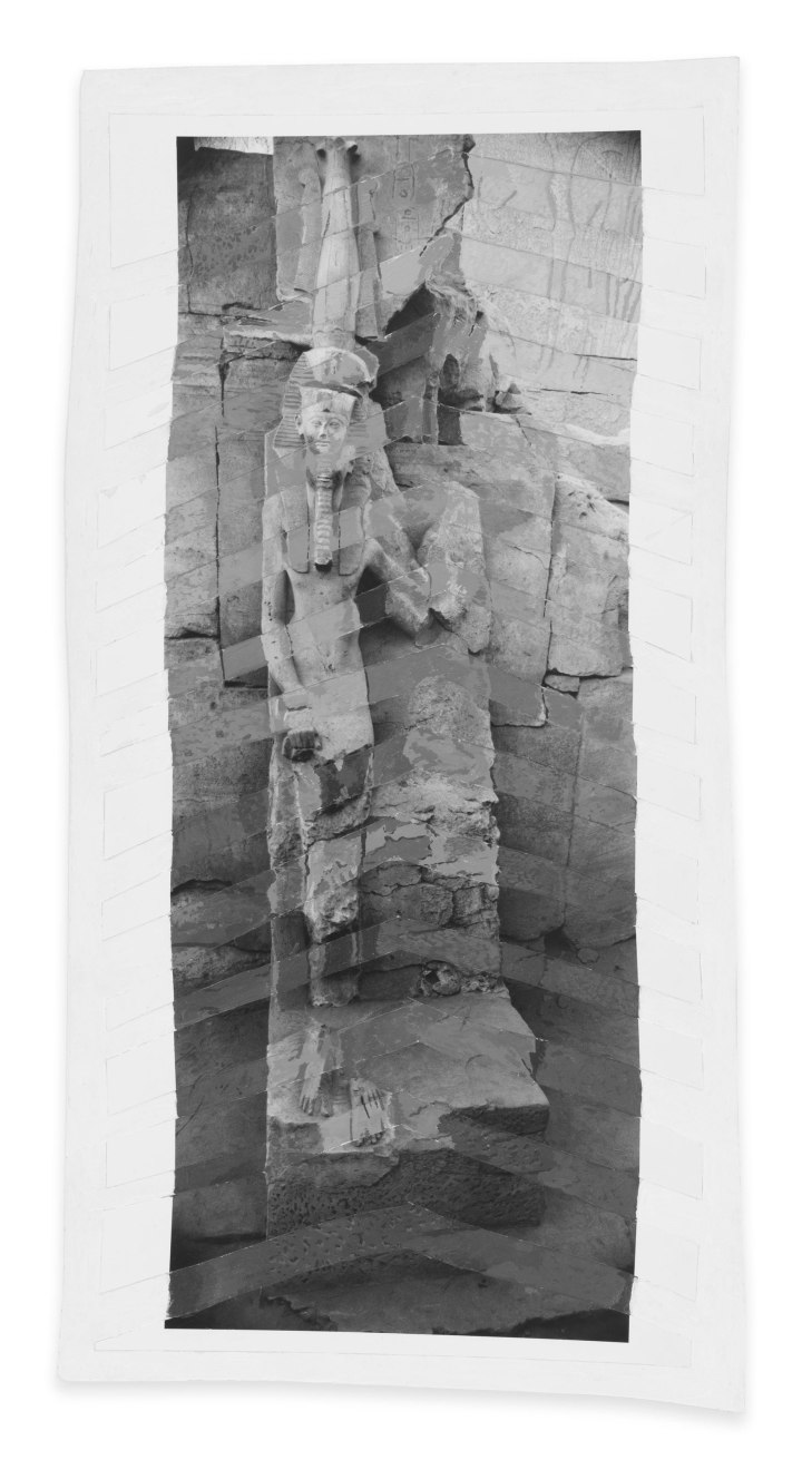 The works that followed reflected Pindell’s painstaking initial attempts to consolidate memories following her traumatic concussion. In these works, Pindell first cut postcards and photographs into strips before positioning them on the collage, alternating the photographic imagery with acrylic paint, and integrating fragmented images into layered fans of paint and paper. “I was trying to unite and heal my fractured brain,” she said.