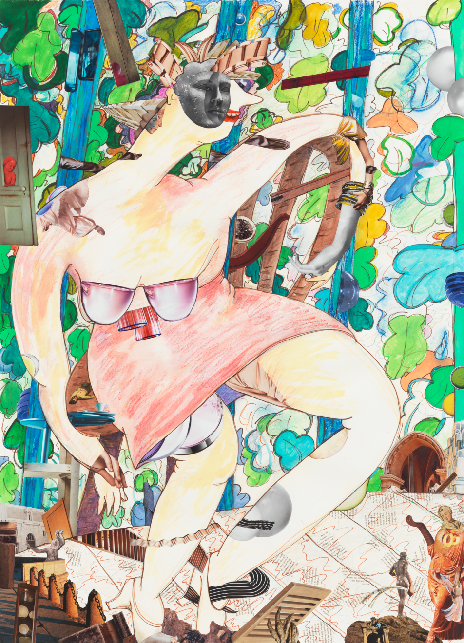 The exhibition and its accompanying publication focus on three distinct series in Nilsson's work—Plant (2010), A Girl in the Arbor (2013), and A Walk… (2014). Paintings in each one incorporate large passages of collage, “sloppy drawings” in ink, colored pencil and gouache, as well as the artist's trademark watercolor. Collage last appeared in Nilsson's work circa 1969 in a series of small paintings on Plexiglas. The largest works in the exhibition, A Girl in the Arbor, are among the artist's most formally ambitious. Each of the paintings depicts a single, gargantuan figure sitting, standing, or reclining in an ambiguous outdoor space. Amidst hundreds of collaged onlookers, Nilsson's woman struggles in and out of various slips, girdles, and bras. “For whose benefit,” Storr writes, “is this acrobatic ritual performed? And will the acrobats ever successfully harness or tuck in all the lumps and bulges that seem intent of defying the clothing designed to give them coherence?” Throughout her entanglements, Nilsson's woman never loses her dignity; she remains oddly at ease, despite her obvious vulnerability.