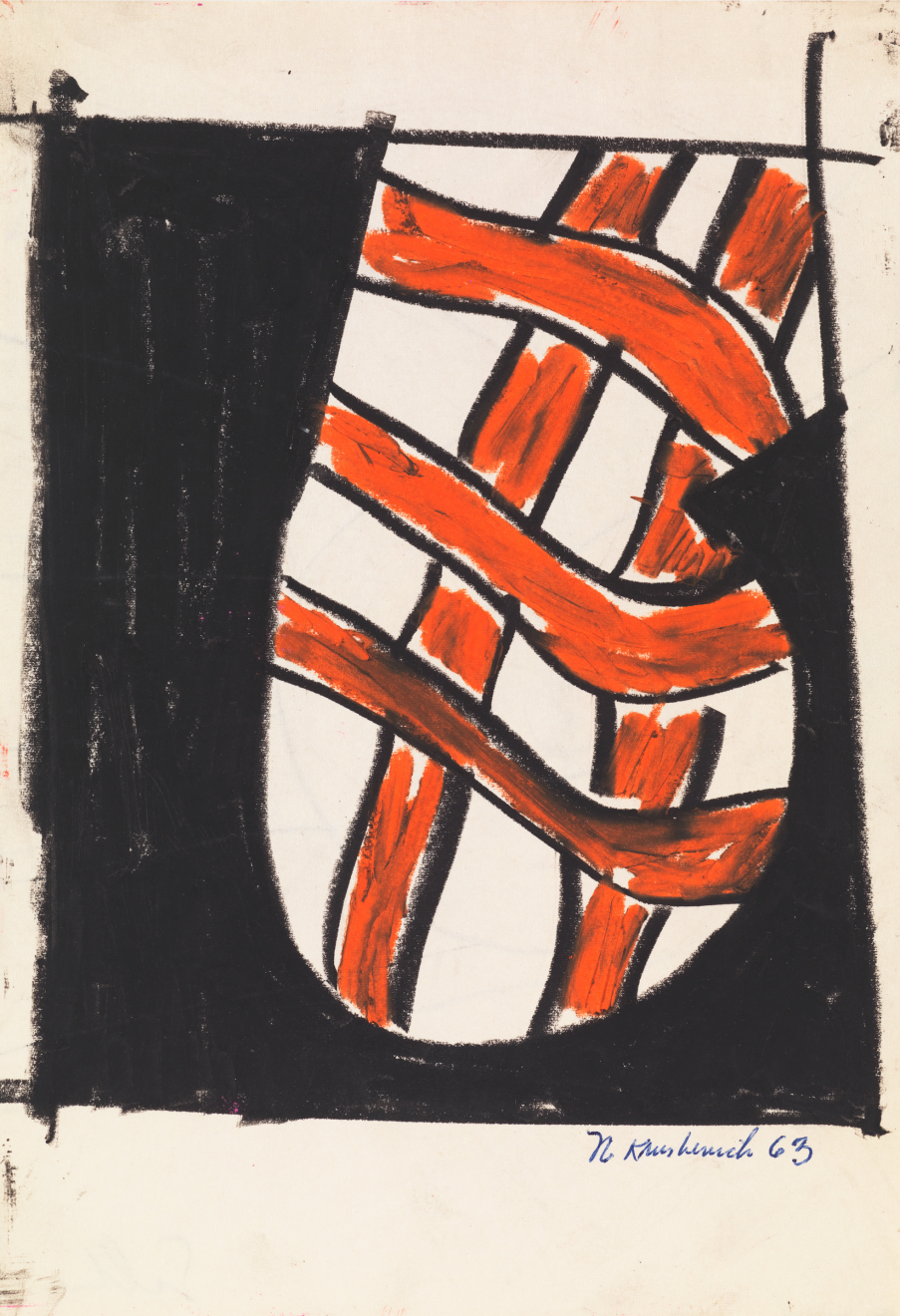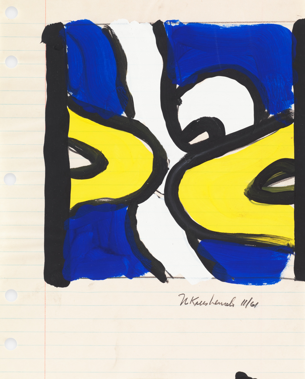 The exhibition offers a detailed view of Krushenick's work from 1961 to 1963—the period of time during which the artist first developed his signature “pop abstract” style. The loose geometries and web-like forms of works such as Sterling Moss at the Esses (1962), Rousseau Giving Love and Lions (1962), and Turn Back Columbus (1963) demonstrate Krushenick's deliberate caricature of Abstract Expressionist “drips” or “skeins” into what more closely resemble details from cartoons—like Superman's hair follicles, as critic Robert Rosenblum once described. A special section of the exhibition will be devoted to what Krushenick considered his first “mature” painting, Untitled (1961). Although small in scale, the artist worked on it intensely, creating dozens of drawings in order to perfect the composition.